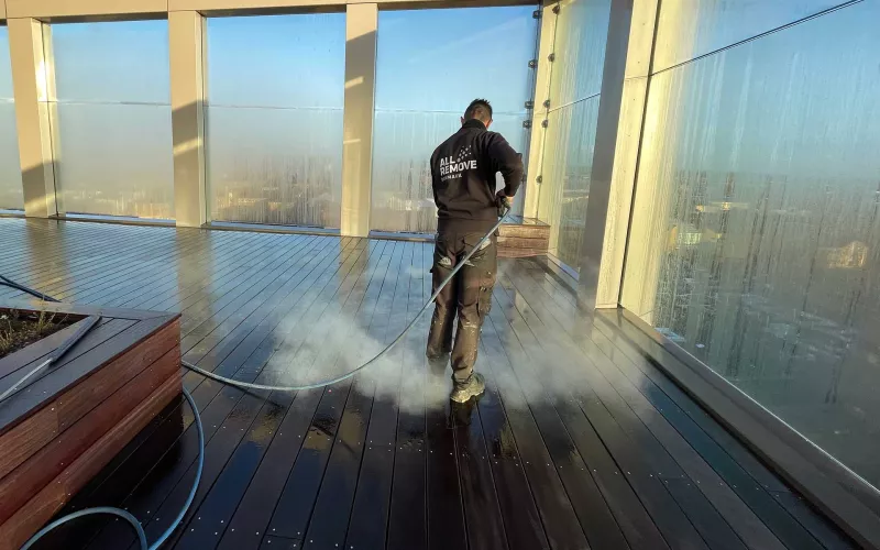 Hvid er en sart farve. Alligevel lykkedes det os at afrense en yderst tilsmudset hvid betontrappe i Københavns Nordhavn. Nu fremtræder trappen igen hvid og ren.